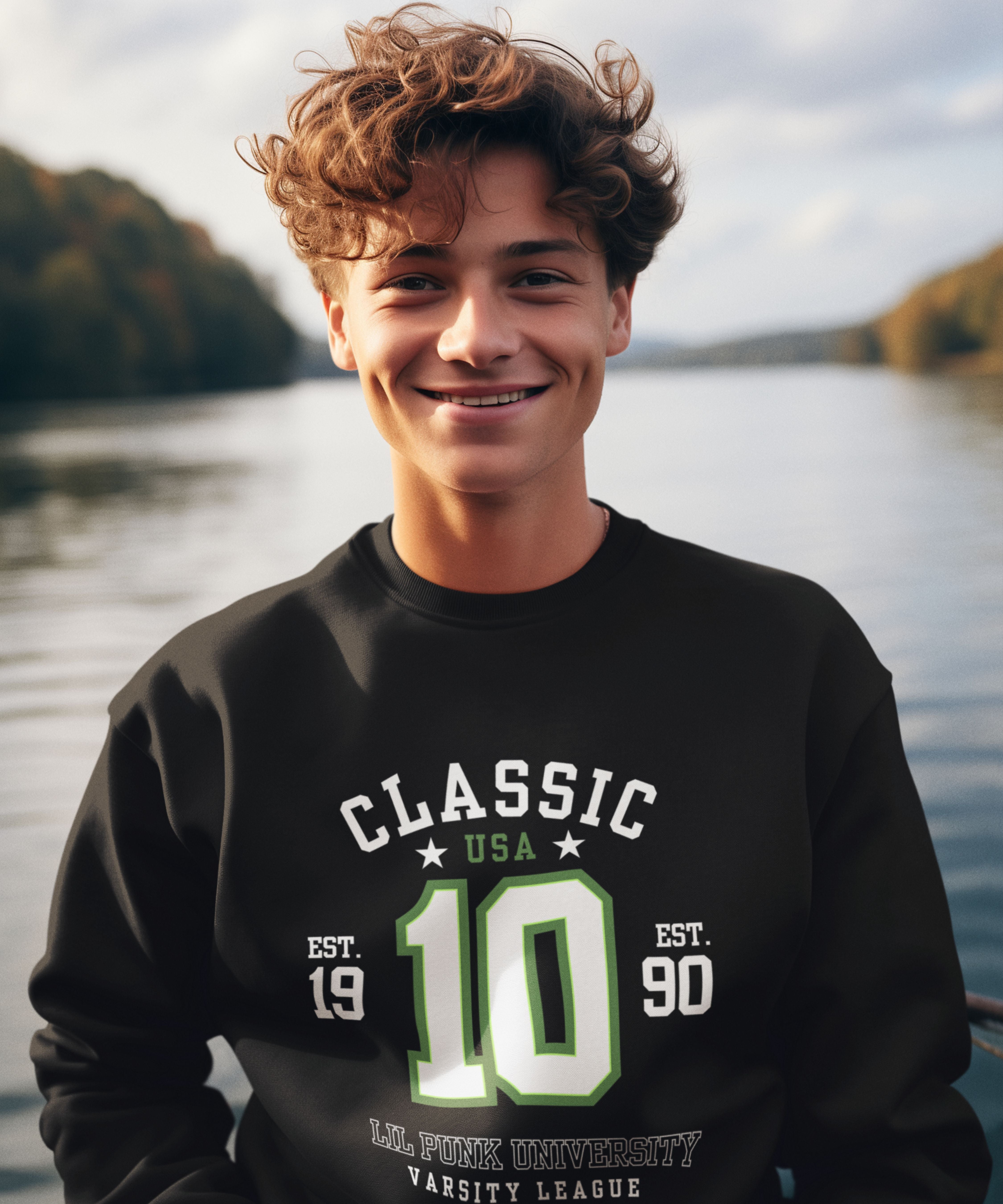 Bring home all-star energy with this standout varsity-style sweatshirt featuring a bold “CLASSIC 10” front graphic inspired by sports league heritage and streetwear flair. Designed with athletic-inspired typography, iconic collegiate elements, and star-studded details, this design oozes retro cool with a modern street twist. The vibrant green-lined number and "Lil Punk University Varsity League" tag add a rebellious charm, perfect for kids who play hard and stand out louder. The back completes the statement with “Small size, Big attitude” — a nod to every Lil Punk’s big personality. A head-turning piece that blends sporty confidence and unapologetic swagger — only from the Glitch Lil Punks drop.