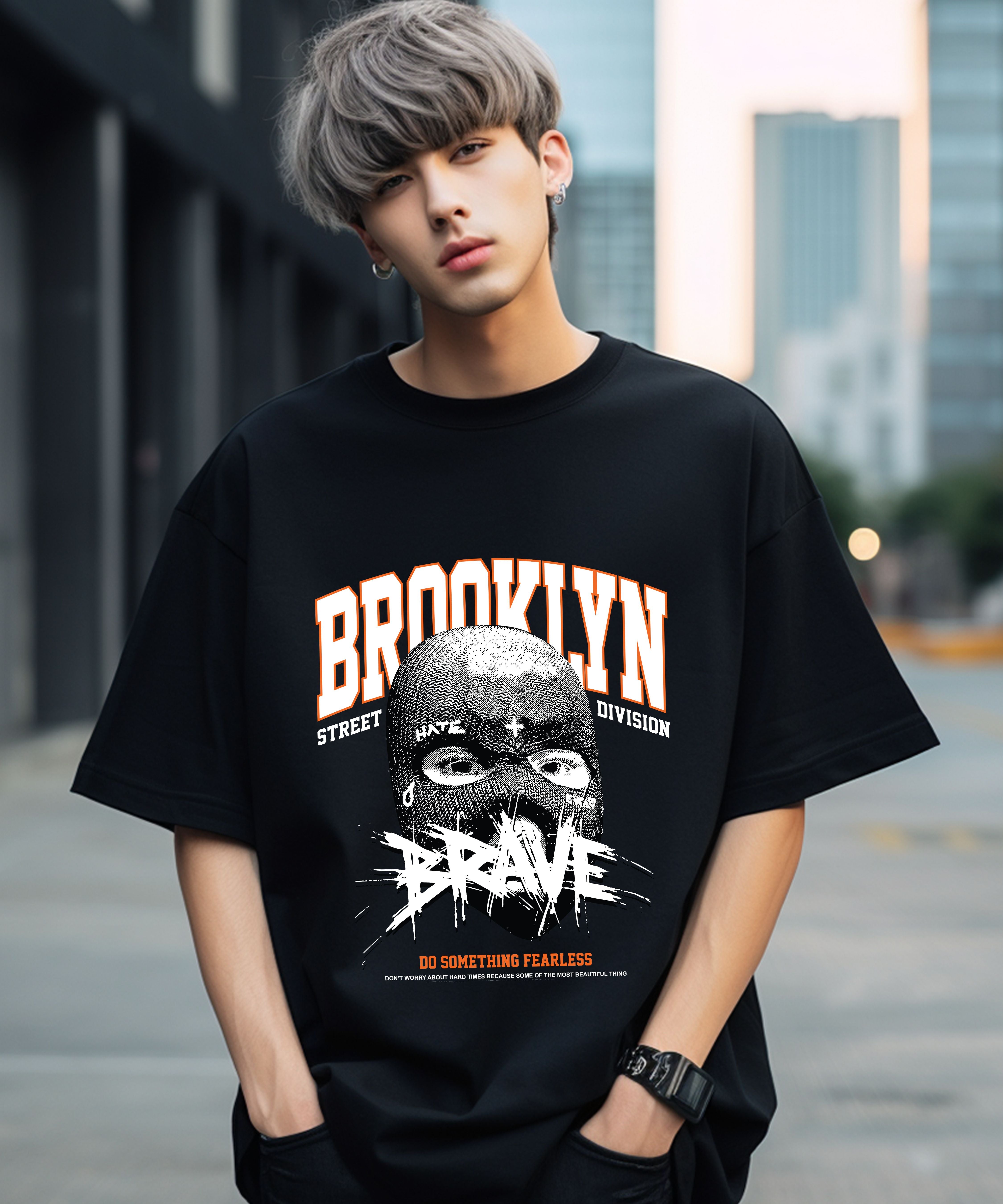 Striking ski mask illustration with textured detail. Prominent "BROOKLYN STREET DIVISION" branding. Impactful "BRAVE" graphic overlay. Motivational "DO SOMETHING FEARLESS" message. Urban and thought-provoking streetwear style