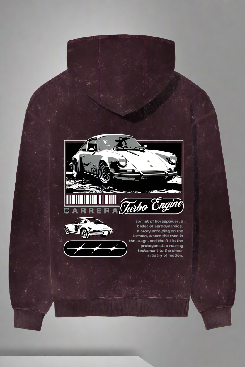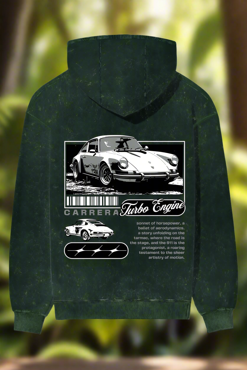 A tribute to horsepower and heritage, this acid-washed hooded sweatshirt fuses retro racing culture with gritty streetwear attitude. Featuring a high-contrast back print of the iconic Porsche 911 Carrera with a poetic ode to speed, this piece is more than fashion — it’s motion frozen in fabric.