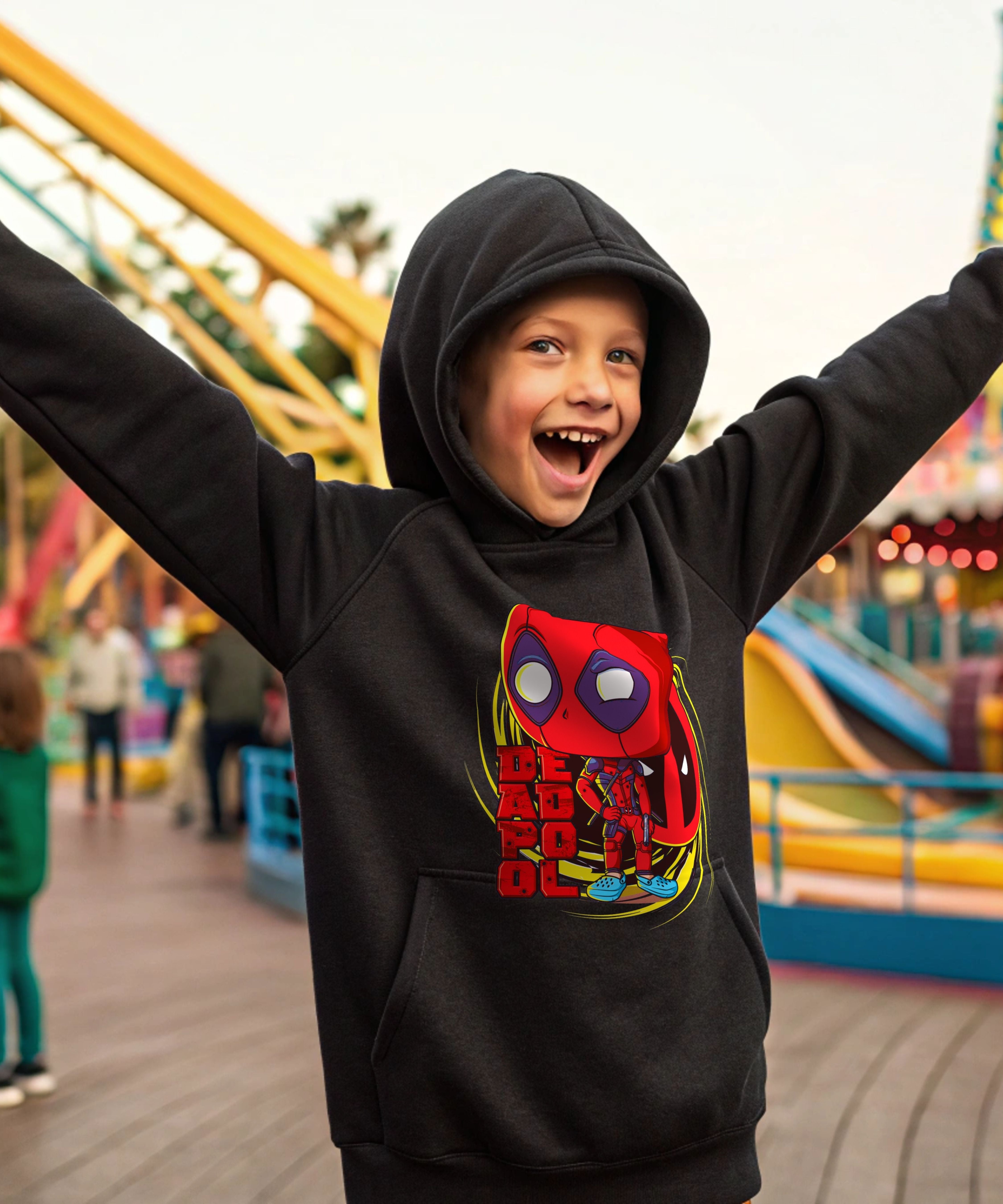 Bringing chaos, color, and charisma to the streets — this Lil Punks hoodie design features a fearless mini vigilante in a red-and-black tactical suit, standing locked and loaded with mischievous energy. Surrounded by bold comic-style typography and a high-contrast swirl of yellow and black, the graphic pops with urban attitude and playful rebellion. From his expressive stare to the quirky blue kicks, every detail is packed with personality, making it a standout piece for kids who love action, humor, and serious drip.