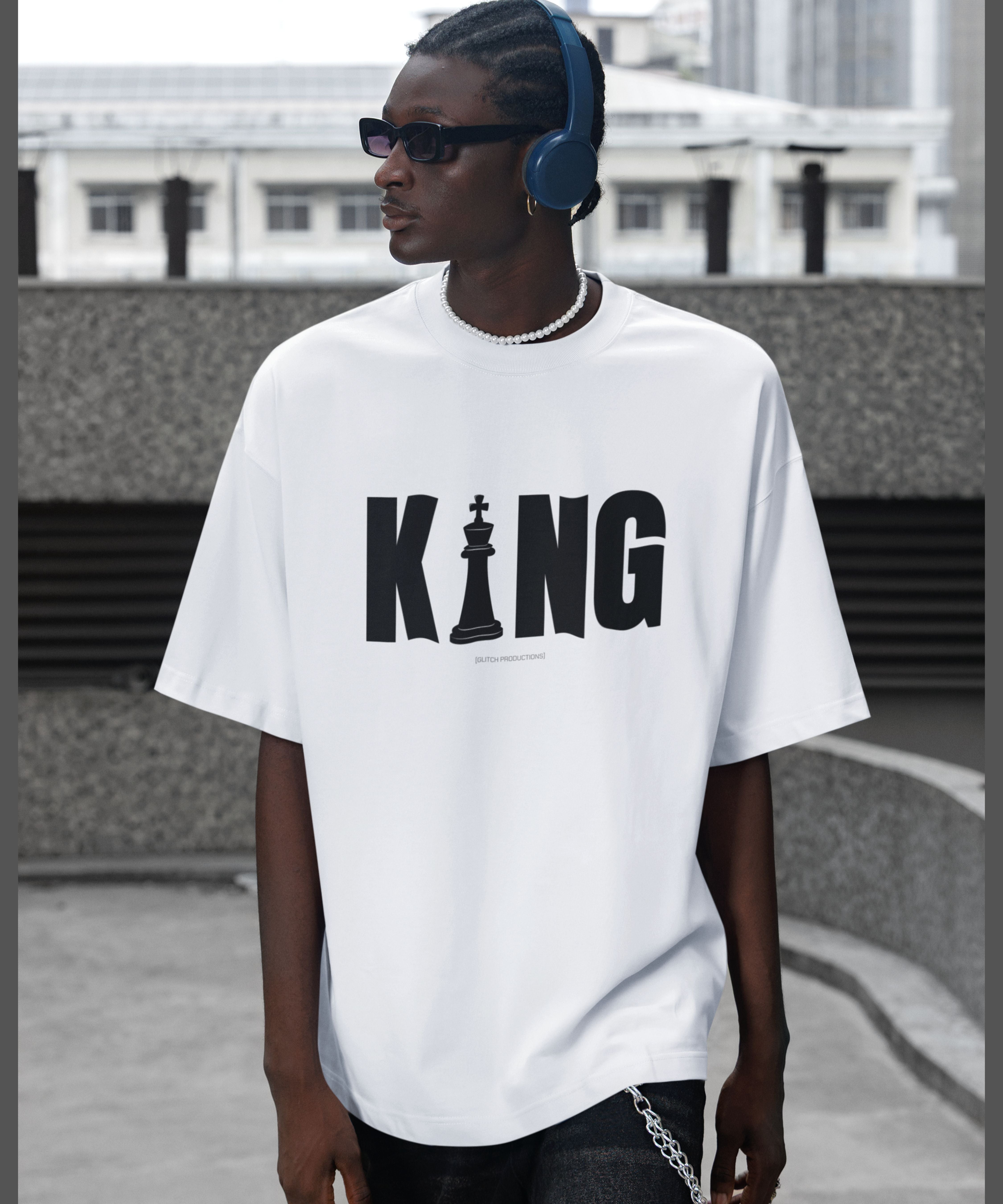 This Tee delivers a bold statement with the word “KING” rendered in a sharp, modernist block font. Subtly glitched and outlined in a rectangular tech-style frame, the design reflects quiet dominance and digital-era confidence. Executed in deep black puff print, it adds elevated texture and a tactile edge while maintaining a sleek, minimal look. Symbolic of strength, self-mastery, and street royalty, this graphic captures the glitch aesthetic in its purest form—uncompromising, clean, and commanding. Whether you lead the pack or move in silence, this piece crowns your presence with undeniable energy.