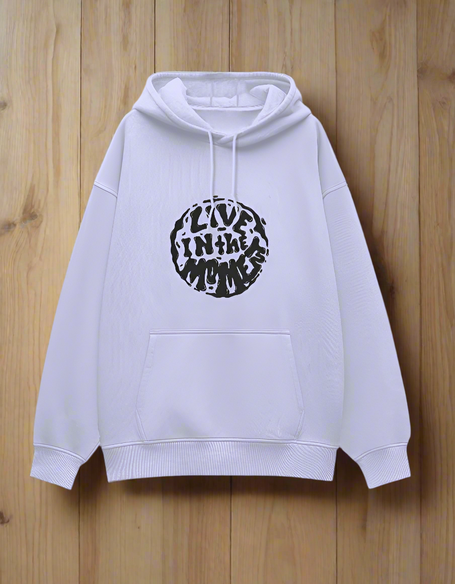 The “Live In The Moment” design brings a surreal, fluid distortion to a mindful message—perfectly aligned with the Glitch Wear tone. The typography melts into an abstract, circular form, echoing the chaotic calm of the digital world. Printed in bold grey and black puff print, the elevated 3D effect adds depth and texture, making the words feel alive—almost breathing out of the fabric. This piece blurs the line between streetwear and visual philosophy, ideal for those who want their fit to say something deeper while keeping it street-ready and bold.