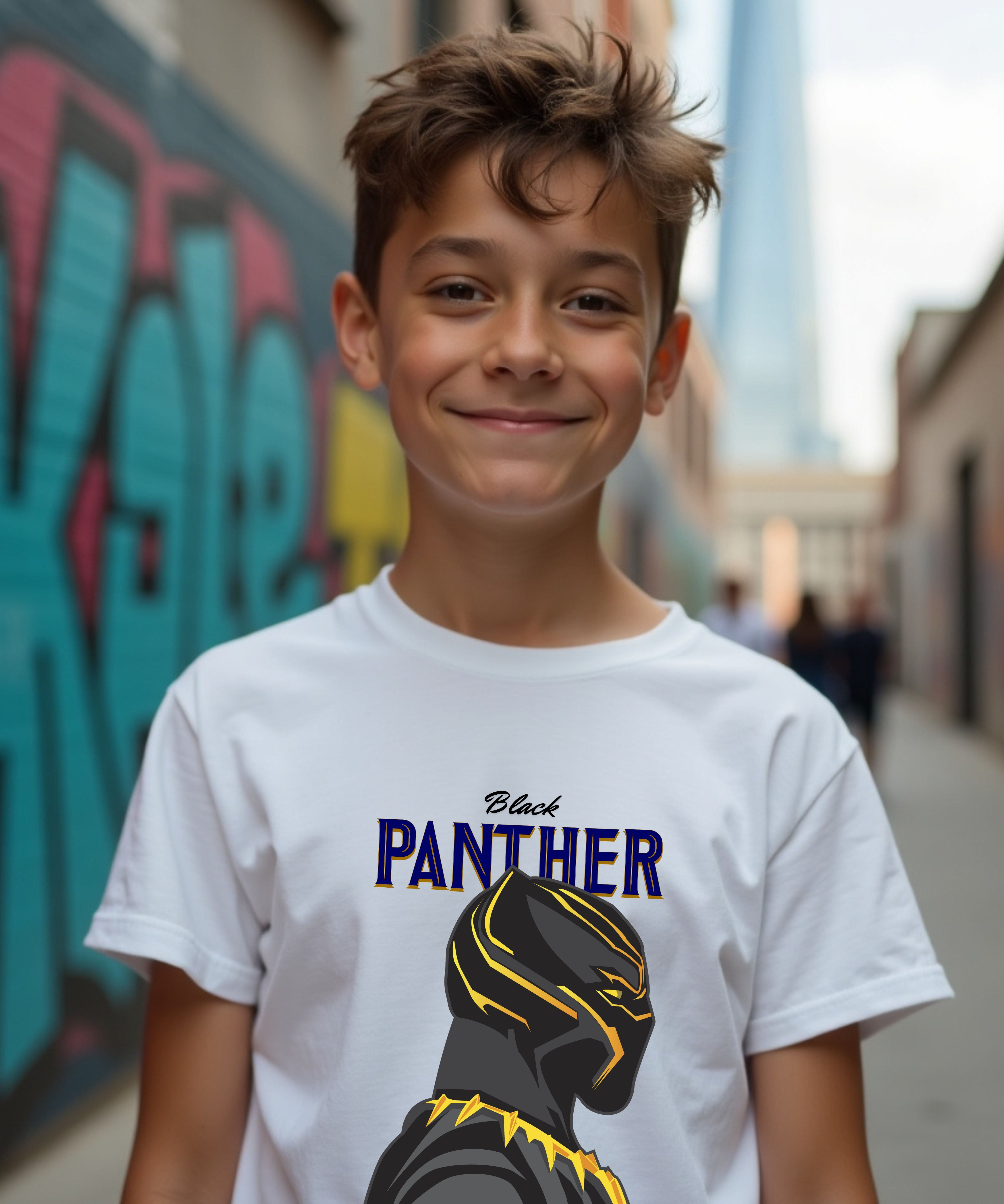 Unleash the power of the jungle with this bold and fierce panther-inspired graphic tee. Featuring a striking side profile of a masked warrior in sleek black with glowing gold accents, this design radiates stealth, strength, and royalty. The bold “PANTHER” typography above adds a vintage comic-book vibe, while the angular lines and sharp detailing give it a modern streetwear twist — perfect for little rebels with a wild side. Whether on the playground or the block, this tee brings heroic energy and standout style to every move. Made for kids who rule their world.