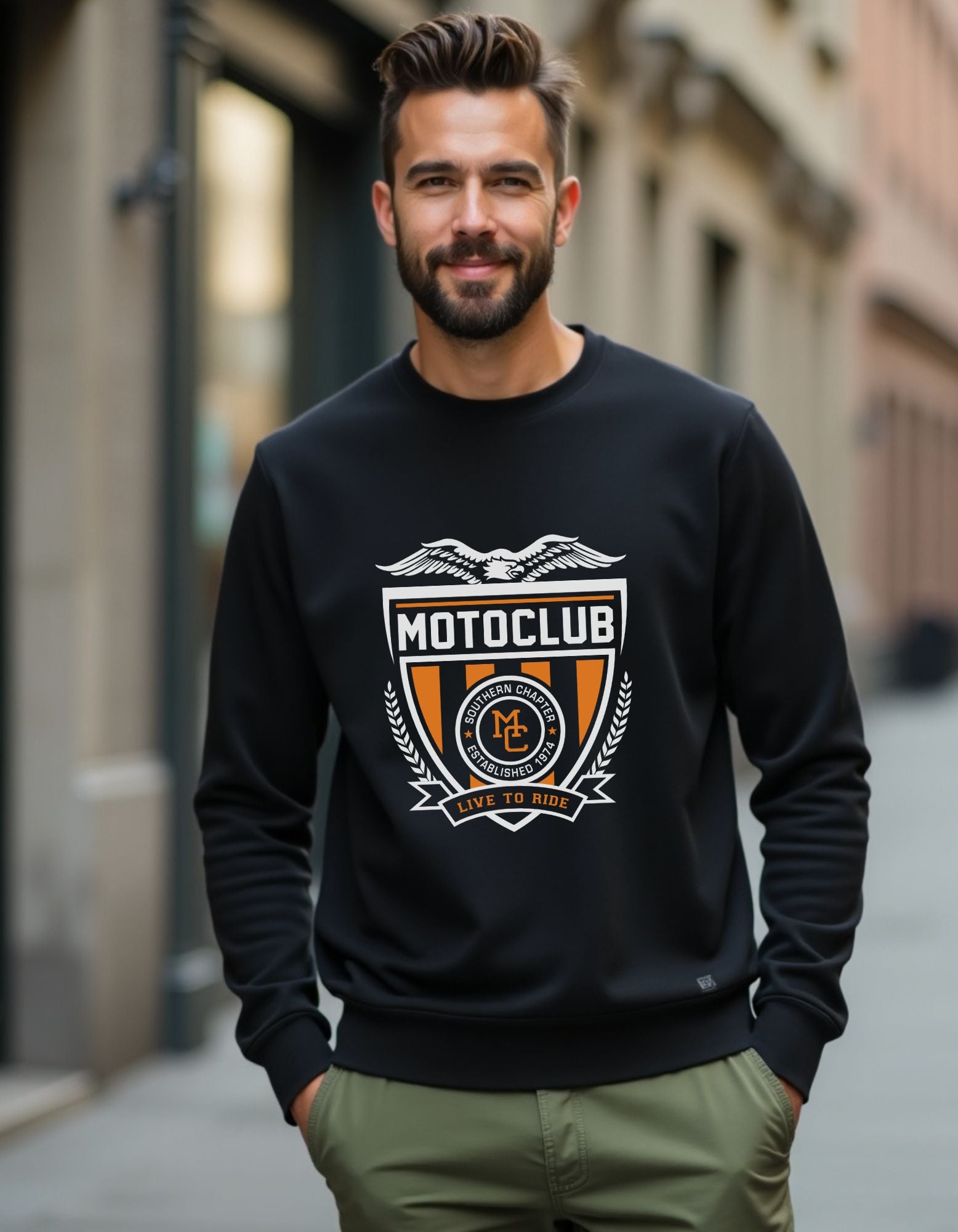 This bold front design features a vintage-inspired motor club crest, showcasing strong shield lines, soaring wings, and heritage-style typography that captures the spirit of freedom and rebellion. The color scheme of deep black, sharp orange, and white evokes classic biker aesthetics with a modern streetwear twist. Centered around a powerful “Live to Ride” slogan and emblematic symbols, this graphic pays tribute to timeless motor culture and road warriors. On the back, a striking dual-engine insignia with the word ‘Motorcycles’ boldly completes the design, making this sweatshirt a staple for those who ride with style and attitude. It’s not just fashion — it’s a lifestyle statement for men who embrace movement, power, and purpose.