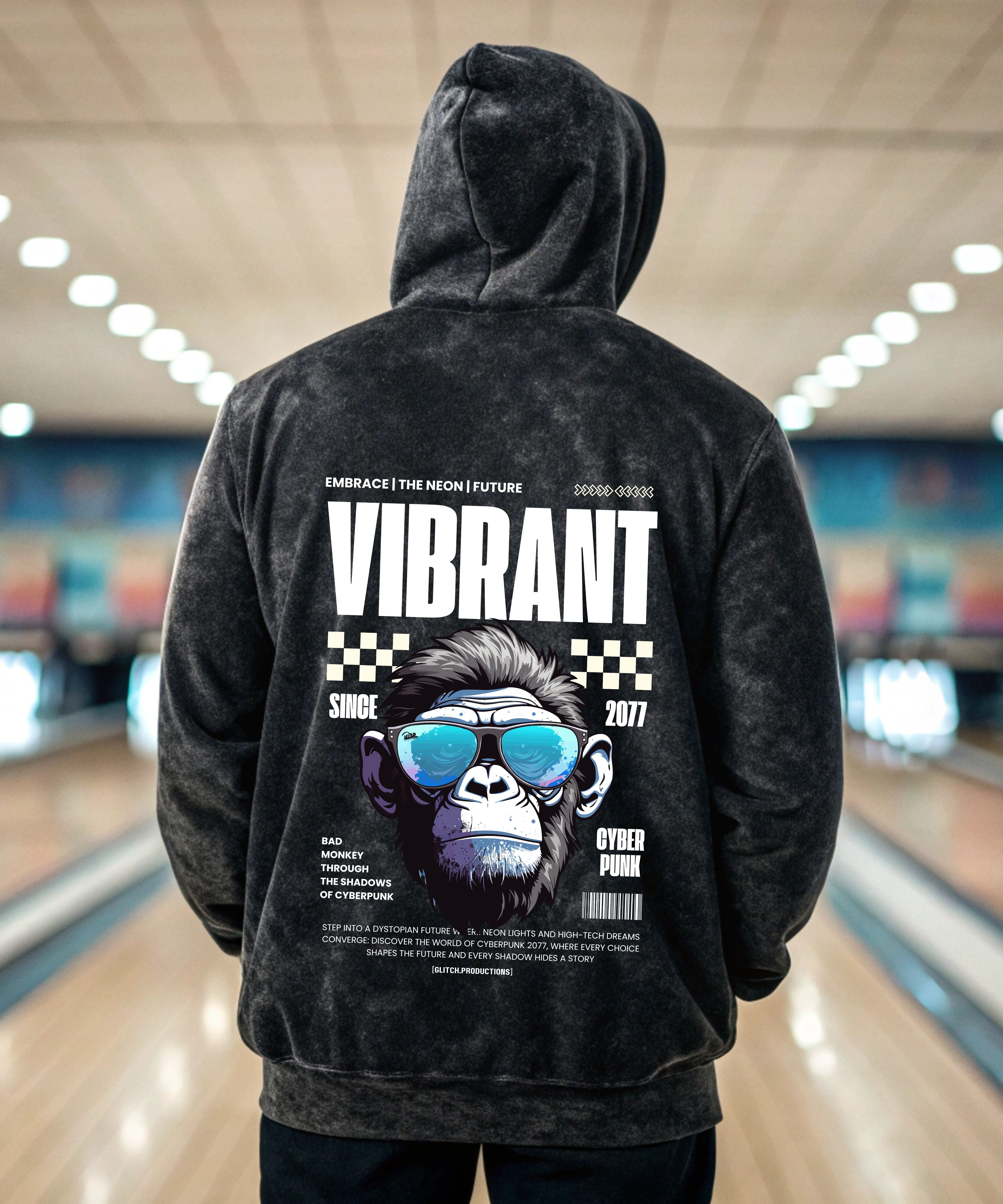 Bold Back Print – “VIBRANT MONKEY” cyberpunk-inspired design for standout streetwear vibes. 300 GSM Brushed Fleece – Heavyweight warmth with a premium hand feel. 100% Super-Combed Cotton – Ultra-smooth, breathable, and built to last. Acid Washed Finish – Unique texture and color variations on every piece. No Two Hoodies Alike – Each one is custom-washed for an individual look. Pre-Shrunk Fabric – True-to-size fit, no surprises after the first wash. Derby Ribbed Hem & Cuffs – Structured comfort and clean silhouette. Unisex Fit – Designed for all genders, fits just right. Double-Stitched Construction – Built tough with in-house premium craftsmanship.