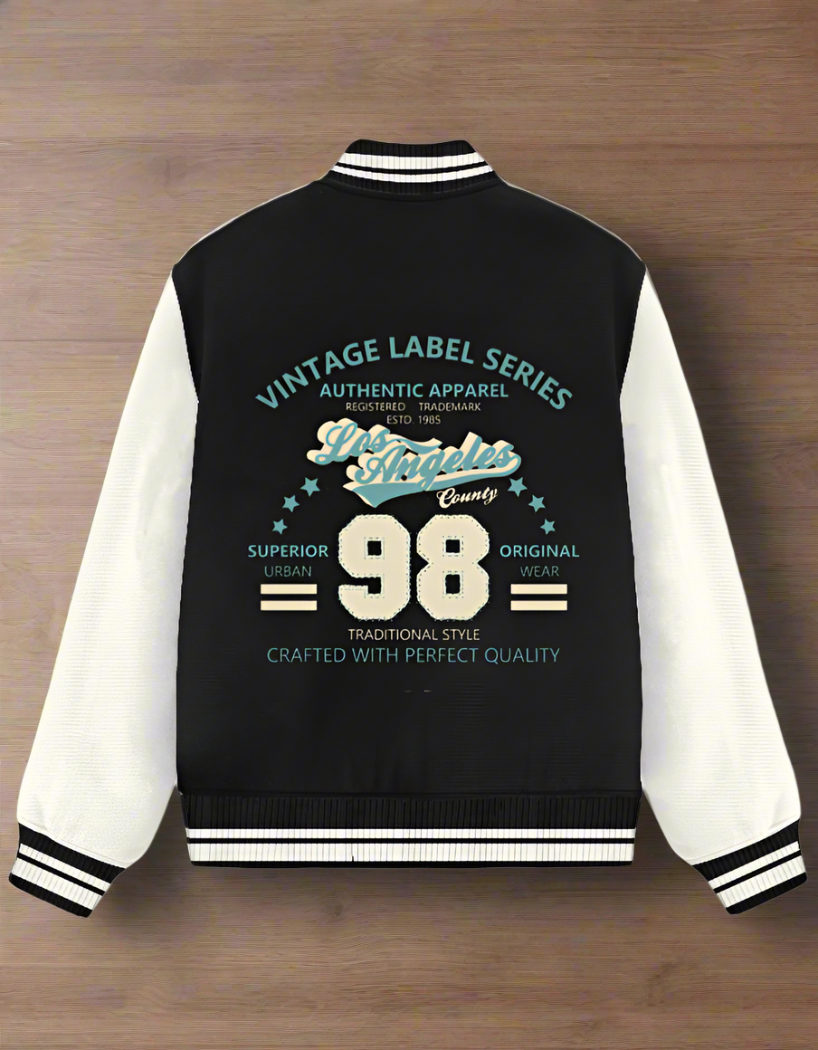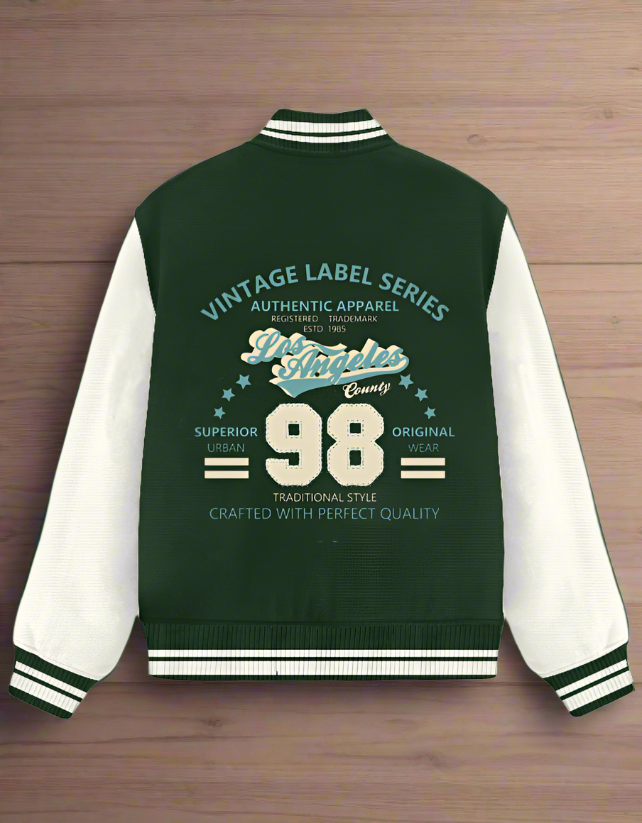 Elevate your streetwear game with this Vintage-inspired varsity jacket featuring a standout DTF print on the back that fuses throwback athletic aesthetics with classic Americana. The bold "98" patch-style graphic is framed by retro typography and stars, creating an old-school look with timeless appeal. A varsity-style “G” on the front left chest keeps the design grounded in identity and attitude. With its rich burgundy body, contrasting white sleeves, and premium detailing, this jacket channels the spirit of traditional collegiate style with a street-ready twist.
